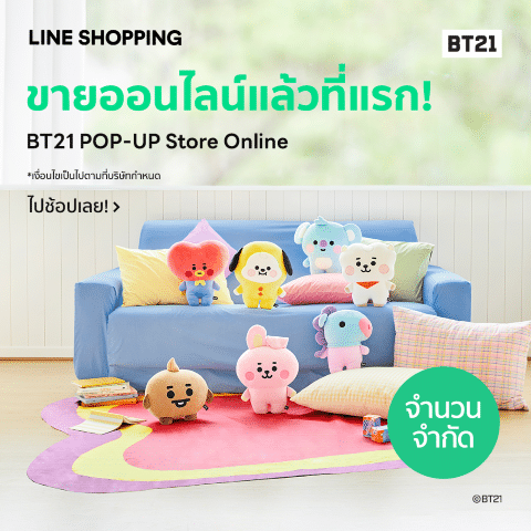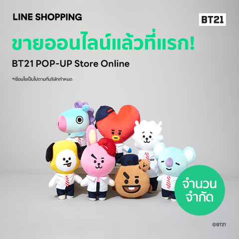 LINE SHOPPING จัดให้ตามคำเรียกร้อง ยกขบวนสินค้าคาแรคเตอร์ระดับโลก BT21 กว่า 100 รายการ พร้อมให้คุณชอปออนไลน์สินค้าลิขสิทธิ์แท้ง่ายๆ ที่ LINE SHOPPING เป็นช่องทางออนไลน์ที่แรกและที่เดียวในประเทศไทย ให้เหล่าแฟนๆ ได้เลือกชอปด้วยตัวเองอย่างจุใจไม่ต้องฝากใคร แถมมั่นใจว่าได้ของแท้แน่นอน 100% ส่งตรงถึงบ้านทันที นอกจากนี้ยังได้สะสม LINE POINTS ไว้ใช้เป็นส่วนลดครั้งหน้าอีกด้วย เตรียมพบสินค้าใหม่ๆ ที่ขนมาอีกเพียบเพื่อต้อนรับเทศกาลของขวัญส่งท้ายปีเก่าต้อนรับปีใหม่ เริ่ม 4 ธันวาคมนี้