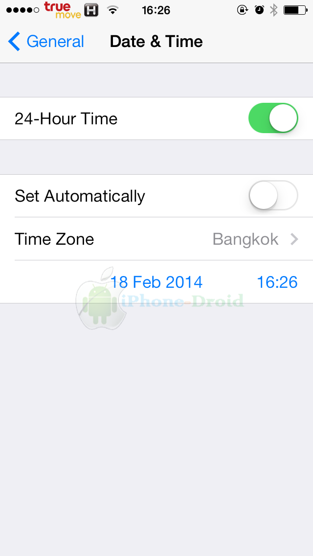 ก่อนอื่น จะต้องตั้งวันที่ก่อนวันที่ 19 กุมภาพันธ์ 2557 ฉนั้นให้ตั้งวันที่ของตัวเครื่องเป็นวันที่ 18 กุมภาพันธ์ 2557 ก่อนนะครับ ไปที่ Settings > General> Date & Time เเล้วปิด Set Automatically และตั้งวันที่เองครับ เป็นวันที่ 18 กุมภาพันธ์ 2557 (2014)
