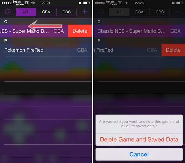 วิธีลบเกมส์จาก GBA4iOS ให้เลือกไปที่เกมส์ และปัดไปทางซ้ายแบบในภาพนี้นะครับ แล้วลบได้เลย