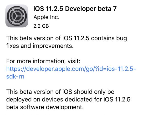 iOS 11.2.5 Developer Beta 7 นี้เป็นเวอร์ชั่น GM ซึ่งจะเป็นเวอร์ชั่นเดียวกับตัวเต็มที่กำลังจะปล่อยออกมาให้ผู้ใช้งานทั้วไปได้อัพเดทกันในเร็ว ๆ นี้ โดยมีขนาดไฟล์ใหญ่ถึง 2.2 GB เลยทีเดียว ข้อสังเกตของเวอร์ชั่น GM ก็คือขนาดไฟล์ที่ใหญ่กว่าทุก Beta ที่ผ่านมาเนื่องจากเป็นการอัพเดทสำหรับทุกอุปกรณ์ที่รองรับที่รันบน iOS เวอร์ชั่นก่อนจึงจำเป็นต้องมีการอัดไฟล์ทั้งหมดที่มีการเปลี่ยนแปลงลงไปในเวอร์ชั่นนี้
