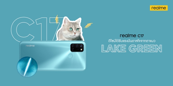 realme C17 มาพร้อมกับหน้าจอ Refresh rate 90Hz ให้คุณเพลิดเพลินไปกับทุกความบันเทิงได้ลื่นไหลกว่าที่เคย และอีกหนึ่งไฮไลท์กับดีไซน์ที่โดดเด่นด้วยแรงบันดาลใจจาก Cat’s Eye หรืออัญมณีล้ำค่า “เพชรตาแมว” ให้ความรู้สึกแวววาว น่าค้นหา เปรียบได้กับความแวววาวของทะเลสาปและพื้นผิวมหาสมุทร ซึ่งมาด้วยกัน 2 สีพร้อมพื้นผิวฝาหลังที่แตกต่างกัน คือ Lake Green ที่มาพร้อมฝาหลังแบบพื้นผิวด้าน และ Navy Blue ที่มาพร้อมฝาหลังสะท้อนแสงพร้อมไฮไลท์เอฟเฟกต์ เพื่อเพิ่มทางเลือกให้คนรุ่นใหม่ได้รับดีไซน์ที่ตอบโจทย์กับไลฟ์สไตล์ได้อย่างลงตัว