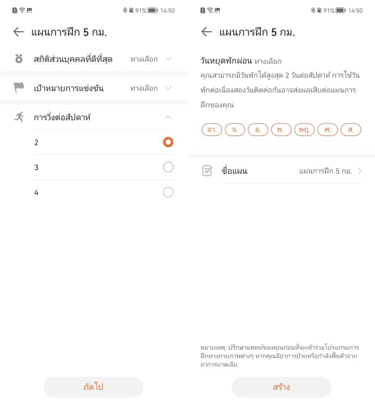 ส่วนใครที่เพิ่งเริ่มออกกำลังกาย ก็จะมีฟีเจอร์ Intelligent Dynamic Adjustment Plan (คอร์สและแผน) ที่ให้เราได้สร้างแผนการออกกำลังกายของตัวเองรายสัปดาห์ได้อย่างเหมาะสม โดยจะเป็นแผนการฝึก 5 กม. ก็จะมีกำหนดว่าเราจะวิ่งอีกวันต่อสัปดาห์ เมื่อเลือกแล้วก็สามารถเลือกวันหยุดพักผ่อนได้ 2 วันต่อสัปดาห์
