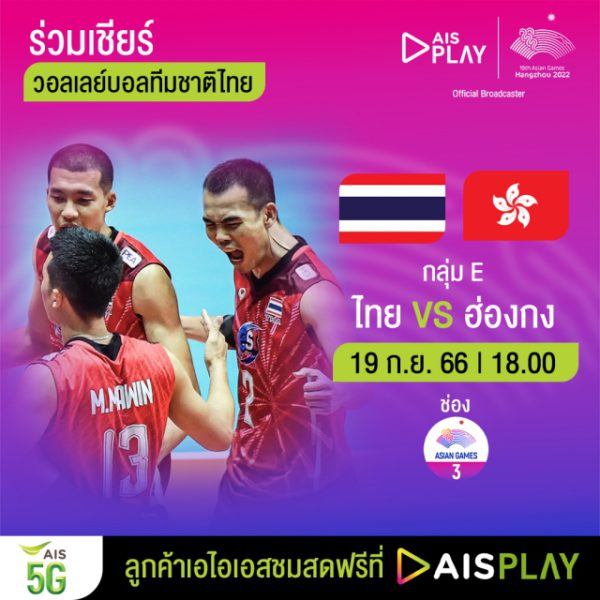 AIS PLAY ชวนลูกค้าและคนไทยส่งใจเชียร์ทีมช้างศึกและทีมลูกยางชายไทยกับมหกรรมกีฬา “เอเชียนเกมส์ครั้งที่ 19 หางโจว 2022” นัดแรกยิงสดจากหางโจว 19 กันยา พร้อมนับถอยหลังสู่พิธีเปิดครั้งสำคัญอย่างเป็นทางการ