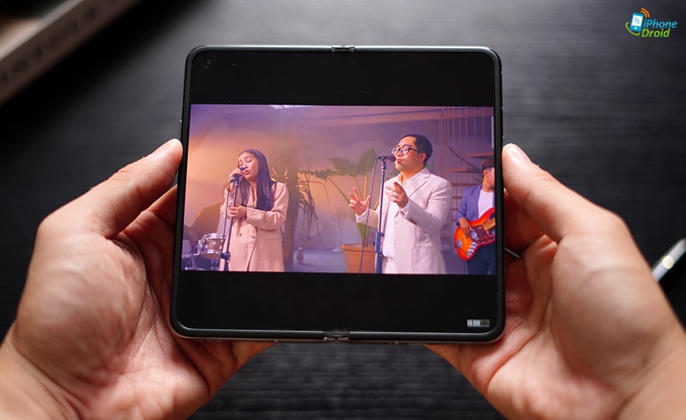อย่างที่บอกไปว่าจอด้านนอกนั้นให้อัตราส่วนมาดีมาก ที่แบบที่ใช้ดูหนังได้สบาย ๆ แต่ก็มีขนาดเล็กไปนิด แต่ถ้าจะขยายจอใหญ่อัตราส่วนก็ไม่ได้ยาวพอที่จะใช้ดูหนังเท่าไหร่ เท่าที่เราลองเปรียบเทียบขนาดดูแล้ว ถ้าเป็นวิดีโอสเกล 21:9 จะมีความใกล้เคียงกันมาก ๆ เรียกว่า ไม่ต้องกางออกมาก็ได้ถ้าไม่อยากได้เสียงแบบ 2 ทิศทาง