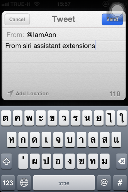 ตัวอย่างคำสั่งที่ผมจะทดสอบให้ดูคือ สั่งให้ siri tweet ขอความไปยัง twitter ครับ โดยผมสั่งว่า tweet From siri AssistantExtensions