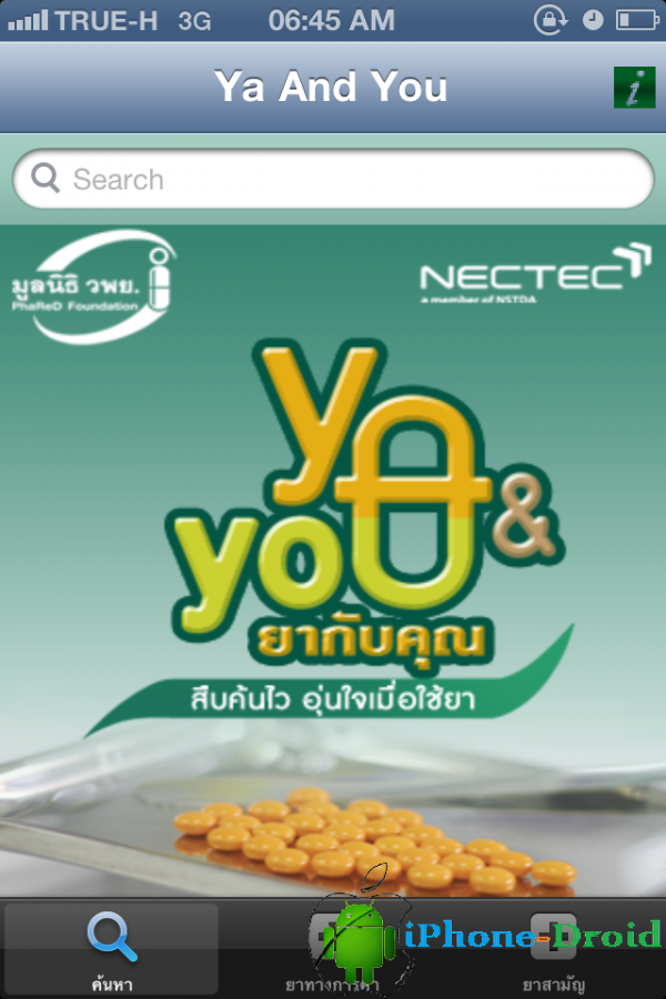 เรามาดูกันครับว่าที่มีประโยชน์นี่เป็นยังไงบ้าง หน้าแรกที่เราเข้ามาครับจะพบกับช่องค้นหาซึ่งเราสามารถค้นหาชื่อยาได้ทั้งภาษาไทยและภาษาอังกฤษครับ โดยแค่เพียงกรอกชื่อยาไปเท่านั้นรายชื่อยาก็จะปรากฎขึ้นมาทันทีครับผม