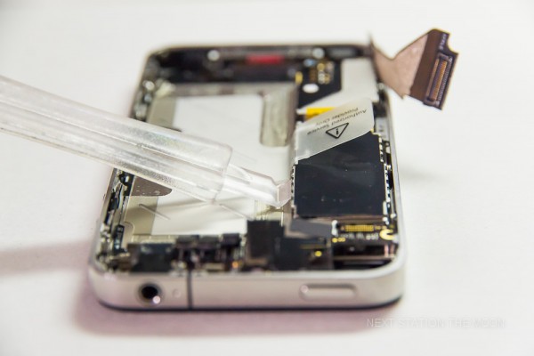 เราจึงมีตัวช่วย เป็นตัวยกอีกตัวนึงครับ หน้ากว้างหน่อย เวลายกทำมุมองศาให้ดีๆครับ ไม่ฉะนั้นจะทำให้แบตออกมาไม่สวยได้ ขั้นตอนนี้ ประกอบกับต้องระวังที่หุ้มแบตลอกด้วยนะครับ มันจะติดกับกาวแน่นมาก เอาเป็นว่าค่อยๆดึงออกมาแล้วกันครับ งัดไปเรื่อยๆ