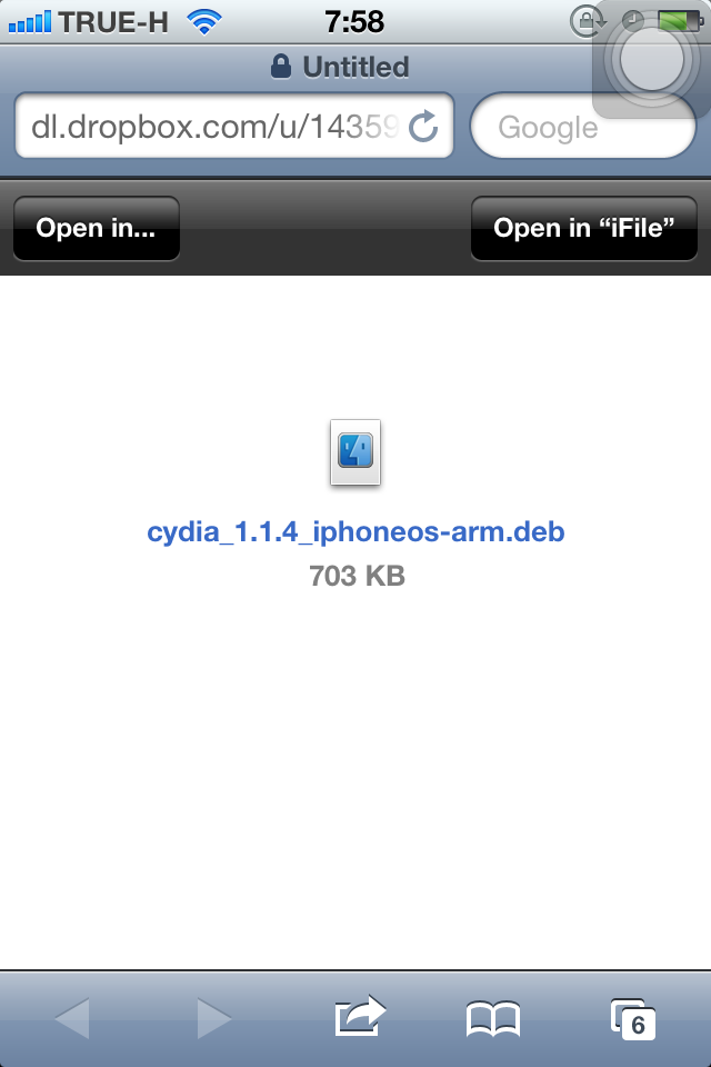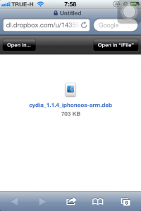 2. การอัพเดทจะใช้ safari ในการดาวน์โหลด โดยพิมพ์ที่ชอง url : http://db.tt/M2HsSbuY เพื่อดาวน์โหลด Cydia 1.1.4 deb แล้วเลือก Open in “iFile”