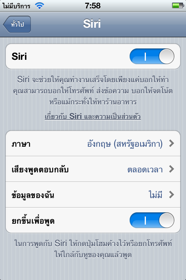 Step 6) –  เมื่อเสร็จเรียบร้อยแล้วให้ไปเปิดใช้งาน Siri โดยเปิดที่ Settings > General > Siri > On ต่อด้วยเลือก ข้อมูลของฉันให้เป็นชื่อของเราใน contacts เพื่อที่เวลา siri ตอบกลับจะได้เรียกเป็นชื่อเราครับ  และเปิด Location Siri ที่ Settings > Loaction Services > Siri > on