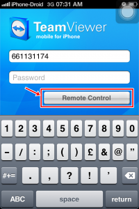 เมื่อเปิดโปรแกรมบน Desktop เตรียมไว้เรียบร้อยแล้วคราวนี้ก็มาเปิดโปรแกรมที่ iPhone เครื่องเก่งของเรากันครับ ในช่อง TeamViewer ID ให้ใส่ ID ของเพื่อนเราได้เลยครับ ยกตัวอย่างด้านบน (661131174 ไม่ต้องเว้นวรรค) และ Passก็ใส่รหัส 4 หลัก ( 6478 ) ได้ทันทีครับ เมื่อใส่ครบแล้วเลือกที่ Remote Control