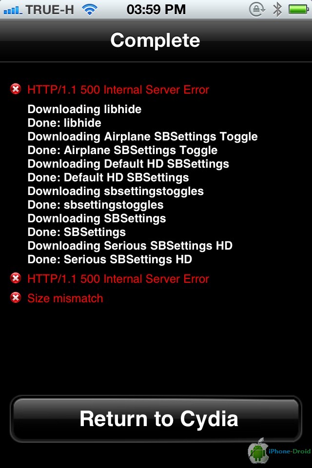หลายคนคงต้องเจอประโยคนี้ HTTP/1.1 500 Internal Server Error ระหว่างพยายามที่จะดาวน์โหลดแพคเกจใน Cydia แต่ไม่ต้องกังวลใจ และไม่ต้องตกใจไปครับ เพราะช่วงเวลานั้นมีผู้เข้าไปดาวน์โหลดบน Cydia มากทำให้ server ล่มครับ ทั้งหมดนี้ก็เป็นเพราะว่าเพิ่งมีการปล่อย Untethered Jailbreak ด้วย Absinthe 2.0.1 สำหรับ iOS 5.1.1 นั่นเอง