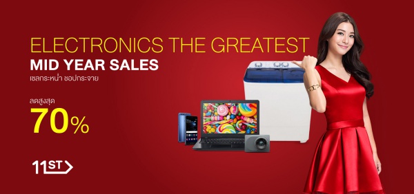 11street ขนทัพสินค้าในกลุ่มอิเล็กทรอนิกส์ยอดนิยมจากหลากหลายแบรนด์ชั้นนำ อาทิ ซัมซุง แอลจี อีเลคโทรลักซ์ พานาโซนิคชาร์ป และอีกมากมาย ไม่ว่าจะเป็นเครื่องใช้ไฟฟ้าภายในบ้าน โฮมเอนเตอร์เทนเมนต์ อุปกรณ์เสริมแก็ดเจ็ต กล้องถ่ายรูปและกล้องวีดีโอ สมาทร์โฟนและแท็บเล็ต กับโปรโมชั่น “Electronics the Greatest Mid Year Sales” ที่นำสินค้าสุดฮอตมาหมุนเวียนกันลดกระหน่ำวันละ 15 รายการ ลดเลย 30 – 70% ทุกชิ้น ตั้งแต่เวลา 11:00 น. ของทุกวัน ช้อปได้แล้วตั้งแต่วันนี้ – 2กรกฎาคม 2560 อย่าช้าสินค้ามีจำนวนจำกัด! โดยตัวอย่างสินค้าไฮไลต์ที่เข้าร่วมรายการ ได้แก่