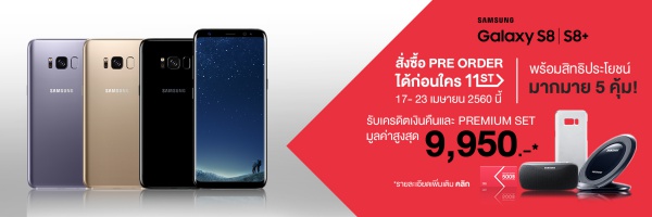 11street ให้คุณคุ้มกว่าถึง 5 ต่อ เมื่อพรีออเดอร์ซัมซุงกาแลคซี่ S8 และ S8+ ที่11street เริ่มพรีออเดอร์ได้ตั้งแต่ 17 เมษายน 2560 เวลา 09:00 น. สำหรับใครที่กำลังรอสุดยอดสมาร์ทโฟนแห่งปีรุ่นใหม่นี้ อย่าพลาดวางแผนก่อนซื้อให้ดี เพราะที่ 11street มีสิทธิประโยชน์ให้มากมายถึง 5 ต่อ ได้แก่