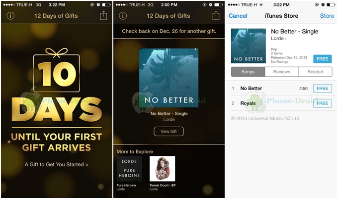หลังจากที่ก่อนหน้านี้แอปเปิลปล่อยแอพ 12 Days of Gift เพื่อที่จะแจกของขวัญปีใหม่ โดยจะเริ่มตั้งแต่วันที่ 26 ธันวาคม 2556 จนถึงวันที่ 6 มกราคม 2557 และในวันนี้แอปเปิลได้แจกเพลงพิเศษ No Better และ MV เพลง Royals จากวง LORDE ซึ่งสามารถโหลดผ่านแอพ 12 Days of Gifts กันได้เลยนะครับ