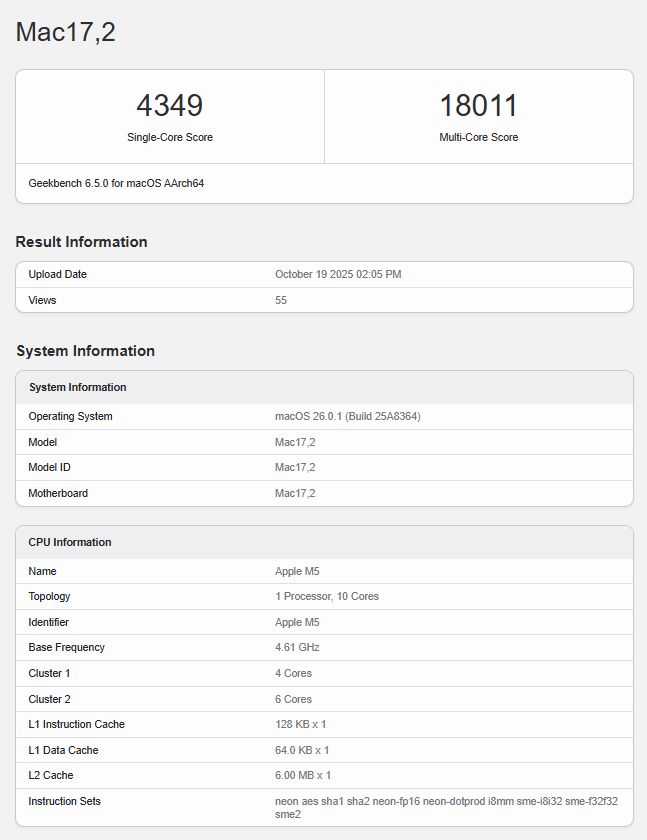 ฝั่งของ MacBook Pro ชิป M5 (Mac17,2) ทำ Single Core ไว้ที่ประมาณ 4,349 แต้ม ซึ่งเป็นคะแนนสูงสุดที่เคยบันทึกไว้สำหรับ Mac หรือ PC ของ Geekbench 6 โดยเร็วขึ้นจากชิป M4 Max ที่ทำได้ 3,914 แต้ม รวมถึงมากกว่าชิป AMD Ryzen 9950X3D ที่ทำได้ 3,399 แต้มด้วย ขณะที่ Multi Core ทำได้ที่ 18,011 แต้ม สูงกว่า MacBook Pro ชิป M4 ในปีที่แล้วราว 20% ที่ทำได้ 14,726 แต้ม