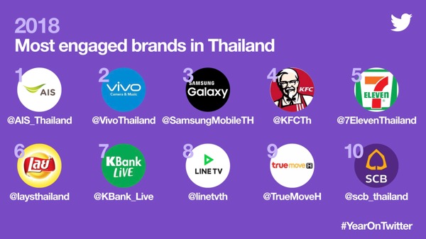 จากการประกาศผล #YearOnTwitter ประจำปี 2018 ในประเทศไทย ปรากฎว่า Twitter @AIS_Thailand ได้รับการจัดอันดับให้เป็นอันดับ 1 ในลิสต์ของ Most Engaged brands in Thailand หรือ แบรนด์ที่ถูกพูดถึงมากที่สุดบน Twitter ประจำปี 2018 เนื่องจากเป็นแบรนด์ที่สามารถสร้างความสัมพันธ์อย่างใกล้ชิดกับลูกค้า ตั้งแต่การทำ Viral Clip, Content Online และการบริหารจัดการ Community