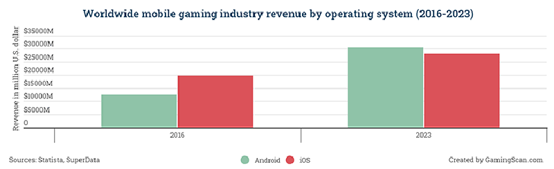 สำหรับรายได้บนสมาร์ทโฟนนั้นมาจากระบบปฏิบัติการ iOS แต่จากการคาดการณ์ในปี 2023 ระบบ Android อาจมีการใช้จ่ายมากกว่า iOS