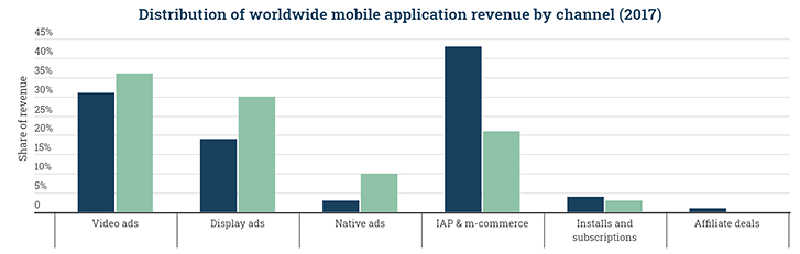 รายได้ต่างๆ ทั่วโลกบนเกมในสมาร์ทโฟนนั้นมาจากการใช้จ่ายในแอปพลิเคชั่น ( in-app purchases) มากกว่า 40% ตามมาด้วยวิดีโอโฆษณาที่ 30%
