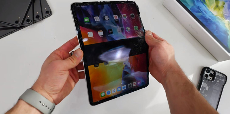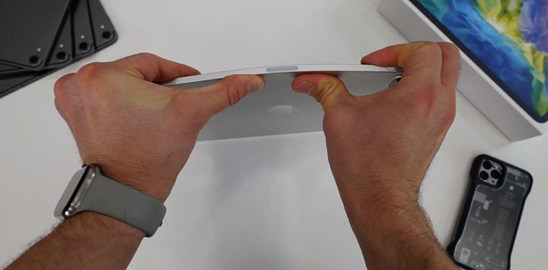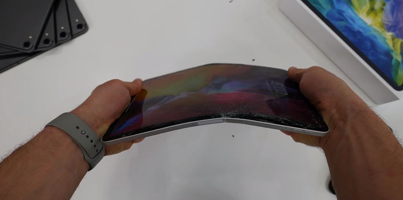 เริ่มจากเขาได้ทำการงอที่ตัวขอบข้าง ซึ่งก็เกิดการงอได้ทันที และเมื่อออกแรงเพิ่มขึ้นก็หักพร้อมจอแตกทันทีที่บริเวณขอบข้าง แต่น่าเหลือเชื่อที่การสัมผัสบนหน้าจอก็ยังทำได้ตามปกติ ต่อมาเมื่อทำการงอที่ตรงกลางหลังเครื่องตามปกติ ก็จะงอได้มากขึ้นและหน้าจอแสดงผลก็เสียหายทันที ซึ่งก็หมายความว่าความทนทานเรื่องการงอแทบไม่ต่างจาก iPad Pro 2018 เลย