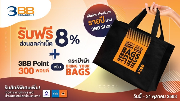 - ชำระที่ 3BB Shop นอกจากจะได้รับส่วนลด 8% และรับสิทธิพิเศษเพิ่มเติมจากธนาคาร กรณีชำระด้วยบัตรเครดิตธนาคารกรุงเทพ บัตรเครดิตธนชาต และ/หรือบัตรเครดิตนครหลวงไทยแล้ว ยังสามารถเลือกรับโบนัสพอยต์จาก 3BB อีก 300 พอยต์ หรือกระเป๋าผ้าลดโลกร้อน Bring Your Bag ที่ผลิตขึ้นสำหรับลูกค้า 3BB โดยเฉพาะ