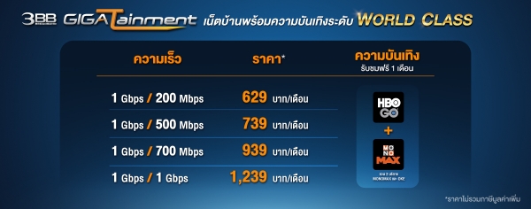 ในช่วงปลายไตรมาสที่ 1/2563 3BB ได้ออกแพ็กเกจเน็ตบ้านพร้อมความบันเทิงในนาม GIGATainment และโดยให้ความเร็วขั้นต่ำที่ 1Gbps พร้อมสิทธิ์ดู HBO GO และ MONOMAX 1 เดือน โดยมีความเร็วให้เลือก 4 แพ็กเกจตามความต้องการใช้งาน