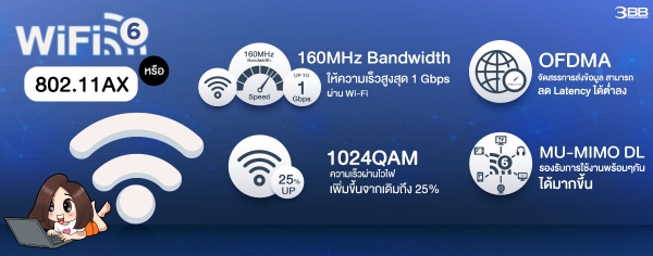 Wi-Fi 6 ใช้มาตรฐานในการเชื่อมต่อที่มีชื่อเรียกว่า 802.11AX หรือ ไวไฟ AX ซึ่งพัฒนามาจากไวไฟ AC หรือ Wi-Fi 5 รองรับคลื่น 2.4GHz และ 5GHz ให้ความเร็วที่สูงขึ้นในระดับ Gigabit มีการเข้ารหัสสัญญาณ 1024QAM ทำให้สามารถ รับ-ส่งความเร็วผ่านไวไฟเพิ่มขึ้นจากเดิมถึง 25% ในระยะที่เหมาะสม และมี OFDMA ที่จำแนกและจัดสรรข้อมูลต่างชนิดทำให้รองรับการใช้งานพร้อมๆกันได้มากขึ้นทั้งเครื่องคอมพิวเตอร์โน๊ตบุ๊ค โทรศัพท์มือถือ และอุปกรณ์ IoT ภายในบ้าน สามารถลด Latency ได้ต่ำลง เนื่องจากมีการแบ่งช่องสัญญาณให้เหมาะสมกับการใช้งานของแต่ละ Device จึงเหมาะสำหรับ Game Online หรือ Game Streaming Platform ให้ใช้งานได้ดีขึ้น นอกจากนี้ยังมีคุณสมบัติช่วยบีบสัญญาณและลดจุดอับ ทำให้สามารถกำหนดทิศทางการกระจายของสัญญาณไปยังอุปกรณ์รับโดยตรง การส่งสัญญาณจึงมีประสิทธิภาพมากขึ้น การอัพเกรดเราเตอร์ให้ลูกค้าเป็น Wi-Fi 6 จึงเป็นการเสริมการใช้งานที่สมบูรณ์แบบสำหรับคนยุคดิจิตัลและทุกคนในครอบครัวที่ต้องการเล่นเกมส์ สตรีมมิ่ง ไลฟ์สด โหลดหรือแชร์ไฟล์ใหญ่ๆ ได้เป็นอย่างดี เพื่อรองรับความเร็ว 1 Gbps ผ่านไวไฟให้มาเต็มประสิทธิภาพมากขึ้น