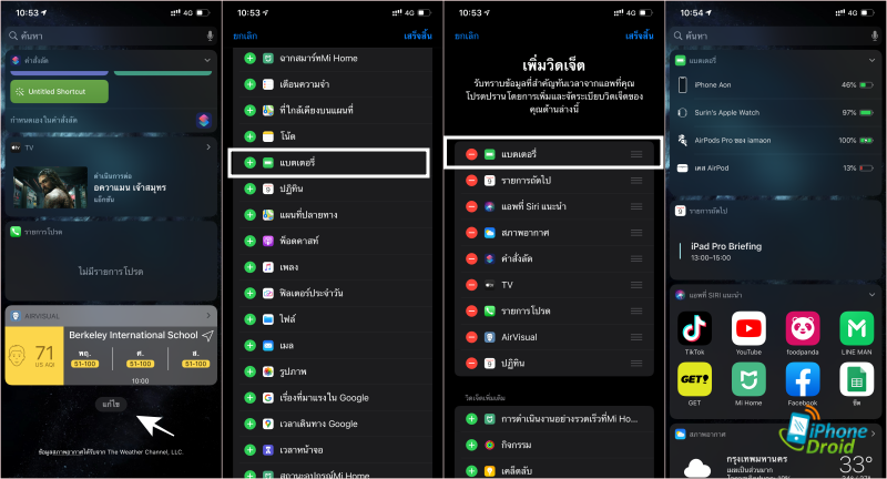 บนหน้า Today View คุณสามารถตั้งค่าเพื่อดูข้อมูลต่างๆ ที่คุณต้องการได้ อาทิ ข่าวประจำวัน, สภาพอากาศ, กิจกรรมบนปฏิทิน หรือ แม้แต่แบตเตอรี่ของอุปกรณ์เสริมต่างๆ อย่าง AirPods ได้บนหน้าล็อคสกรีน โดยคุณสามารถเพิ่มวิดเจ็ต บนหน้า Today View เพียงปัดหน้าจอไปทางขวา จากนั้นเลื่อนลงมาที่ด้านล่าง แล้วแตะปุ่ม แก้ไข > แตะไอคอน + ที่วิดเจ็ต ที่เขียนว่า แบตเตอรี่ และกด เสร็จสิ้น เพียงเท่านี้ คุณก็สามารถตรวจสอบสถานะแบตเตอรี่ได้อย่างง่ายดาย