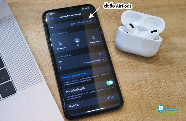 เปิดเคส AirPods ใกล้ๆ iPhone หรืออุปกรณ์ของคุณจากนั้นเข้าไปที่ การตั้งค่า > บลูทูธ > แตะสัญลักษณ์ i ที่อยู่ถัดจาก AirPods ของคุณ > แตะที่ชื่อปัจจุบัน และพิมพ์ชื่อใหม่ที่ต้องการ จากนั้น กดเสร็จสิ้น