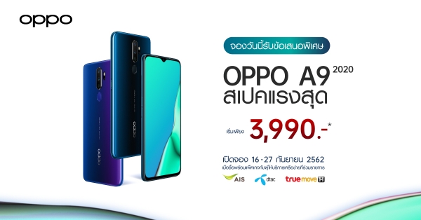 หลังจากเปิดตัว OPPO A9 2020 สมาร์ทโฟนรุ่นล่าสุดจากซีรีส์ A ไปเมื่อวันที่ 13 กันยายนที่ผ่านมาทาง OPPO ก็ได้เปิดให้พรีออเดอร์ พร้อมรับข้อเสนอสุด Exclusive ในราคาเริ่มต้นเพียง 3,990 บาทเท่านั้น เมื่อซื้อพร้อมแพ็คเกจกับผู้ให้