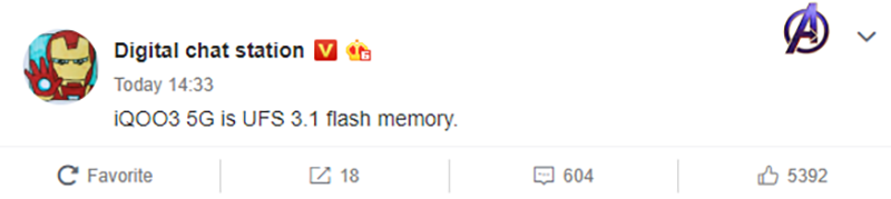 ทั้งนี้ ใน TENAA ระบุด้วยว่า iQOO 3 ยังมีรุ่น RAM 6GB และ 12GB รวมถึง ROM 128/256 ซึ่งบัญชี Digital Chat Station ระบุว่าจะเป็น ROM แบบ UFS 3.1 (เฉพาะรุ่น iQOO 3 5G) ขณะที่เรื่องกล้องจะมาพร้อมความละเอียด 64 + 13 + 13 + 2 ล้านพิกเซล แสดงผลบนหน้าจอ Punch hole ชนิด AMOLED ขนาด 6.44 นิ้ว และมี Refresh Rate 60Hz