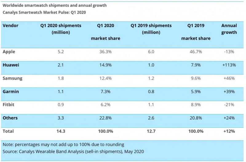 Canalys เผยสถิติยอดขายในตลาด Smartwatch ของทั่วโลกในช่วงไตรมาสที่ 1 ปี 2020 นี้ ซึ่งทำยอดเพิ่มขึ้น 12% แม้ว่าจะอยู่ในช่วงของการระบาด COVID-19 ก็ตาม