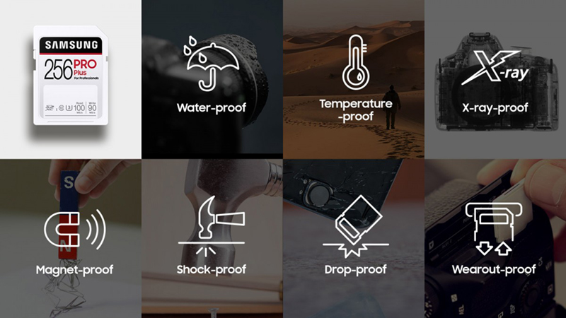 การ์ดทุกรุ่นในนี้สามารถป้องกันน้ำปกติและน้ำเค็มได้ลึกถึง 1 เมตร นานสุดถึง 3 วัน ทั้งยังป้องกันการเกิดความเสียหายจากการตกในความสูง 5 เมตร, ใช้งานได้ที่อุณหภูมิระหว่าง -25 ถึง 85 องศา และยังมีการประกันนานถึง 10 ปีเต็ม