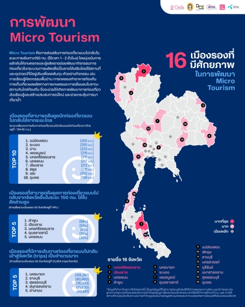 ทั้งนี้ ผู้ศึกษาได้พัฒนาดัชนีชี้วัดศักยภาพของเมืองรองในพัฒนา Micro tourism จาก mobility data โดยใช้ 3 เกณฑ์ชี้วัด ได้แก่ 1. ปริมาณการเดินทางท่องเที่ยวแบบไปกลับที่เข้ามาในพื้นที่ 2.สัดส่วนการเดินทางท่องเที่ยวแบบไปกลับที่สามารถดึงดูดได้จากจังหวัดอื่นในระยะ 150 กม. และ 3. ความสามารถในการดึงดูดการท่องเที่ยวแบบไปกลับได้จากระยะไกล จะพบว่า จังหวัดเมืองรองที่มีศักยภาพในการพัฒนาการท่องเที่ยวแบบ Micro tourism อย่างโดดเด่นมีจำนวน 16 จังหวัดประกอบด้วยจังหวัดนครศรีธรรมราช เชียงราย นครพนม ลำพูน นครนายก ระนอง เพชรบูรณ์ อุบลราชธานี แม่ฮ่องสอน พัทลุง ราชบุรี นครสวรรค์ บุรีรัมย์ มหาสารคราม สุพรรณบุรี และชุมพรตามลำดับ