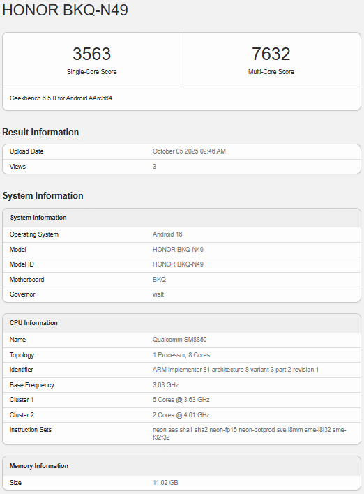 Magic8 Pro ตามที่ปรากฏบน Geekbench ใช้โมเดล Global เป็น BKQ-N49 ที่ยืนยันการใช้หน่วยประมวลผล Snapdragon 8 Elite Gen 5 มี RAM 12GB และรันบนระบบปฏิบัติการ Android 16 ส่วนคะแนน Single Core ทำได้ 3,664 และ Multi Core ที่ 7,632 แต้ม