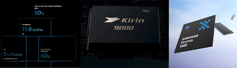 มาต่อที่ชิปเรือธงของ Huawei อย่าง Kirin 9000 ที่มีขนาด 5 นาโนเมตรเท่ากัน แต่มีทรานซิสเตอร์จำนวน 1.53 หมื่นล้านตัว มากกว่า A14 Bionic ภายในมาแบบ 8 คอร์ (Octa-Core) แบ่งเป็น Cortex-A77 ความเร็ว 3.13GHz จำนวน 1 คอร์ + Cortex-A77 ความเร็ว 2.54GHz จำนวน 3 คอร์ + Cortex-A5 ความเร็ว 2.05GHz จำนวน 4 คอร์ โดยใช้ GPU Mali-G78 MP24 แบบ 24 คอร์