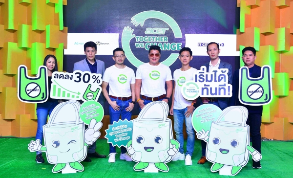 ปัจจุบันปัญหาขยะพลาสติก นับเป็นปัญหาใหญ่ที่ส่งผลกระทบในทุกพื้นที่ และเป็นที่ทราบกันว่าการย่อยสลายขยะพลาสติกนั้นต้องใช้เวลากว่า 450 ปีในการย่อยสลาย ข้อมูลจากกรมควบคุมมลพิษระบุว่า ปริมาณการใช้ถุงพลาสติกหูหิ้วในประเทศมีจำนวน 45,000 ล้านใบต่อปี โดยมีที่มาของถุงเหล่านี้ 3 แห่งด้วยกันคือ ร้อยละ 40 มาจากตลาดสดเทศบาลและเอกชน รวมถึงแผงลอย, ร้อยละ 30 มาจากร้านขายของชำ และร้อยละ 30 มาจากห้างสรรพสินค้าและร้านสะดวกซื้อที่คิดเป็นจำนวน 13,500 ล้านใบต่อปี โดยมีธุรกิจร้านค้าไอทีเป็นหนึ่งในหมวดของห้างสรรพสินค้าและร้านสะดวกซื้อที่มีตัวเลขการใช้ถุงพลาสติกอยู่ที่ 12 ล้านใบต่อปี จากข้อมูลนี้ เอเซอร์ ร่วมกับตัวแทนค้าปลีกไอทีทั่วประเทศ จับมือรณรงค์ลดการใช้ถุงพลาสติก ในแคมเปญ Together We Change เดินหน้าผลักดันการลด/ละ/เลิกใช้ถุงพลาสติกเพื่อร่วมรักษาสิ่งแวดล้อม ลดปัญหาขยะพลาสติก โดยการเน้นทำความเข้าใจผ่านตัวแทนค้าปลีกไอทีทั่วประเทศ ให้ช่วยในการส่งเสริม และเชิญชวนให้ลูกค้าร่วมลดใช้ถุงอย่างจริงจัง เช่น การแนะนำหลังการซื้อสินค้าชิ้นเล็กๆ ให้ลูกค้าใส่ถุงหรือกระเป๋าที่ลูกค้ามีอยู่แล้ว หรือโน้ตบุ๊คที่ปกติการของการซื้อเอเซอร์จะมีกระเป๋าเป้และอุปกรณ์ต่างๆ จัดไว้ให้ ร้านค้าสามารถแนะนำลูกค้าลดปริมาณการใช้ถุงได้โดยการนำโน้ตบุ๊ค พร้อมอุปกรณ์ของแถมต่างๆ ใส่กระเป๋าเป้ให้ลูกค้าถือกลับบ้านได้เลย จากการร่วมมือกันอย่างจริงจังในการรณรงค์ลดการใช้ถุงพลาสติกนี้เราตั้งเป้าไว้ว่าจะสามารถลดปริมาณการใช้ถุงพลาสติกที่จะก่อให้เกิดขยะพลาสติกได้ถึง 3.6 ล้านใบต่อปี หรือคิดเป็น 30% ของการใช้งานถุงพลาสติกในธุรกิจร้านค้าไอที และจะเดินหน้ารณรงค์แคมเปญนี้อย่างต่อเนื่องเพื่อสร้างความต่อเนื่องในการลดปริมาณถุงพลาสติกเพื่อร่วมรักษาสภาพแวดล้อมไปด้วยกัน