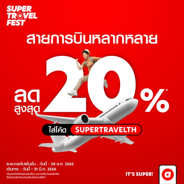 เนื่องในโอกาสสำคัญนี้ airasia Super App ได้จัดแคมเปญ “SUPER Travel Fest” กลับมาเอาใจสายเที่ยวอีกครั้งพร้อมข้อเสนอการเดินทางที่ยิ่งใหญ่และคุ้มสะใจยิ่งกว่าสำหรับทุกคน ตั้งแต่วันที่ 26 – 28 ตุลาคม 2565 นี้เท่านั้น