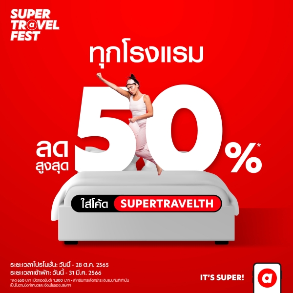 เพลิดเพลินกับข้อเสนอสุดพิเศษด้วยส่วนลดสูงสุดถึง 50% จากโรงแรมชั้นนำมากมาย ณ จุดหมายปลายทางยอดนิยมทั่วโลก และอื่นๆ อีกมากมายตลอดช่วงโปรโมชั่น “SUPER Travel Fest” อย่าลืมใส่รหัส “SUPERTRAVELTH” ที่หน้าชำระเงิน