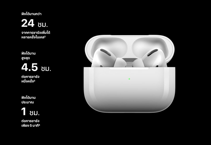 นอกจากนี้ เรื่องของแบตเตอรี่ AirPods Pro สามารถอยู่ได้นานสูงสุด 5 ชั่วโมงเมื่อปิดโหมดตัดเสียงรบกวน และอยู่ได้นาน 4.5 ชั่วโมงเมื่อปิดโหมดดังกล่าว เทียบเท่า AirPods 2 ส่วนระยะเวลาการคุยสามารถคุยได้ต่อเนื่อง 3.5 ชั่วโมง มากกว่า AirPods 2 ที่คุยได้นาน 3 ชั่วโมง