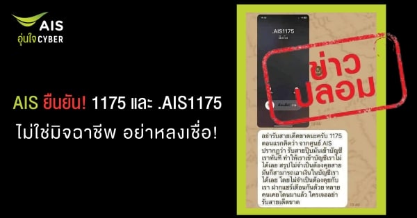 AIS ขอชี้แจงกรณีที่มีการส่งต่อข้อความบนสื่อสังคมออนไลน์ อ้างว่า “หากรับสายจากหมายเลข 1175 หรือ .AIS1175 จะทำให้มิจฉาชีพเข้าถึงบัญชีการเงินและดูดเงินได้ทันที แม้ไม่ได้สนทนา” นั้น ไม่เป็นความจริง