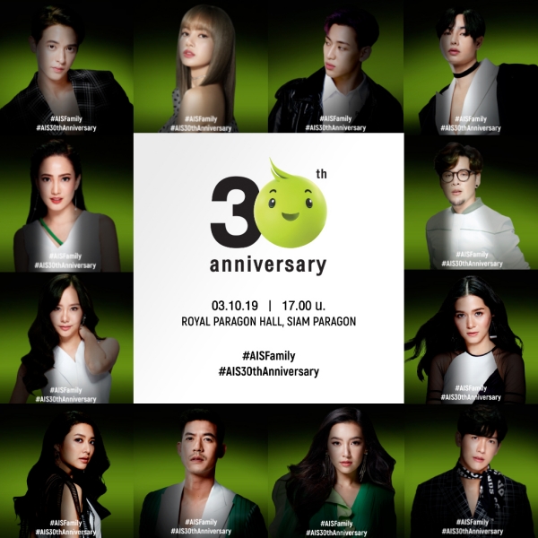เอไอเอส ฉลองครบ 30 ปี จัดงานแถลงข่าวและขอบคุณลูกค้าสุดยิ่งใหญ่ ในวันพฤ.ที่ 3 ตุลาคม 2562 เวลา 17.00 น. ณ รอยัล พารากอน ฮอลล์ ชั้น 5 สยามพารากอน พบกับการรวมตัวของ 12 พรีเซนเตอร์สุดฮอต ได้แก่ เจมส์ จิรายุ, เป๊ก ผลิตโชค, ทอม อิศรา, เต้ย จรินทร์พร, แต้ว ณฐพร, มิว นิษฐา, พุฒ พุฒิชัย, วี วิโอเลต, เวียร์ ศุกลวัฒน์, เบลล่า ราณี, แบมแบม กันต์พิมุกต์, ลิซ่า ลลิษา ที่จะมามอบความสุขและความสนุกครั้งยิ่งใหญ่ ที่ทำให้ทุกคนอุ่นใจยิ่งกว่าเดิม