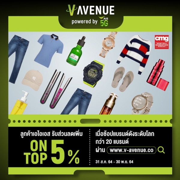 AIS เดินหน้านำศักยภาพโครงข่ายอัจฉริยะ 5G เข้าเชื่อมต่อดิจิทัลไลฟ์สไตล์ผ่านห้างเสมือนจริง V-AVENUE by AIS 5G สร้างความหลากหลายในการช้อปปิ้งให้กับคนไทยอย่างต่อเนื่อง ล่าสุด ผนึกกำลัง เซ็นทรัล มาร์เก็ตติ้ง กรุ๊ป หรือ CMG ในเครือเซ็นทรัล รีเทล ผู้นำในวงการสินค้าแฟชั่น และสินค้าความงามอินเตอร์แบรนด์ ที่บริหารแบรนด์สินค้ากว่า 40 แบรนด์ในประเทศ ยักษ์ใหญ่วงการค้าปลีกของไทย เสริมความแข็งแกร่งแพลตฟอร์ม Omni-Channel สร้างประสบการณ์ช้อปปิ้งที่สะดวกสบายและไร้รอยต่อให้แก่ลูกค้าเปิดพื้นที่ใหม่บน V-AVENUE.CO ภายใต้แนวคิดการช้อปปิ้งแบบ 5G Virtual Commerce จัดเต็มด้วยสินค้ามากกว่า 120 รายการ พร้อมขยายสู่ธุรกิจอื่นในเครือเซ็นทรัล รีเทล อย่าง เพาเวอร์บาย และ ซูเปอร์สปอร์ต ที่เตรียมเข้าร่วมเปิดห้างเสมือนจริง ให้ลูกค้าได้ช้อปปิ้งเข้าถึงสินค้าและบริการได้ทุกที่ ทุกเวลา