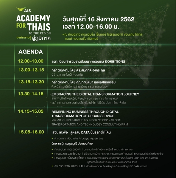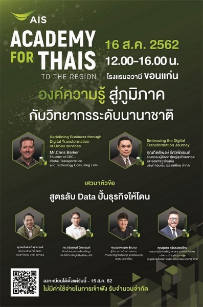 สำหรับงาน AIS ACADEMY for THAIs: to the Region องค์ความรู้ สู่ภูมิภาค ภารกิจคิดเผื่อเพื่อคนไทย จังหวัดขอนแก่น มุ่งหวังที่จะช่วยยกระดับองค์ความรู้และพัฒนาทักษะที่สำคัญต่อการประกอบธุรกิจให้ประสบความสำเร็จ โดยนำเอาหลากหลายประสบการณ์ตรงของผู้เชี่ยวชาญ และนักธุรกิจชั้นนำของไทย มาร่วมถ่ายทอดองค์ความรู้และแลกเปลี่ยนความคิดเห็นในแง่มุมต่างๆ ในการค้นหาคำตอบของการสร้าง Business Transformation ให้ทันต่อกระแสการเปลี่ยนแปลงของเทคโนโลยีในยุคดิจิทัล โดยโฟกัสไปถึงการนำเอาขีดความสามารถของเทคโนโลยีอันหลากหลาย มาใช้ให้เกิดประโยชน์ในการวางแผนและออกแบบระบบคมนาคมขนส่ง รวมทั้ง การนำเอา “ข้อมูล” มาเป็นเครื่องมือสำคัญในการพัฒนาธุรกิจให้เติบโตอย่างยั่งยืน นำโดย Mr.Chris Barker, Founder of CBC – Global Transportation and Technology Consulting Firm / คุณกิตติพงษ์ อัศวพิชยนต์ รองกรรมการผู้จัดการใหญ่ ธุรกิจคลาวด์และซอฟท์แวร์โซลูชั่น บริษัท ไอบีเอ็ม ประเทศไทย จำกัด / คุณอนันต์ แก้วร่วมวงศ์ ประธานเจ้าหน้าที่บริหาร บริษัท ไทยคม จำกัด (มหาชน) / คุณนวลพรรณ ชัยนาม ผู้อำนวยการฝ่ายการตลาด, การบริหารลูกค้าสัมพันธ์ และอีคอมเมิร์ซ วัตสัน ประเทศไทย / คุณสุรเดช ทวีแสงสกุลไทย กรรมการผู้จัดการใหญ่ และประธานเจ้าหน้าที่บริหาร บริษัท ช ทวี จำกัด (มหาชน) และผู้ร่วมก่อตั้ง บริษัท ขอนแก่นพัฒนาเมือง (เคเคทีที) จำกัด และ ดร.กวิณพงศ์ ฉัตรานนท์ หัวหน้าแผนกงานบริหารข้อมูลและวิเคราะห์ข้อมูล Big Data เอไอเอส พบกันในวันศุกร์ที่ 16 สิงหาคม 2562 ณ โรงแรมอวานี ขอนแก่น โฮเทล แอนด์ คอนเวนชั่น เซ็นเตอร์ ผู้ที่สนใจลทะเบียน ร่วมงานได้ฟรี! ตั้งแต่วันนี้ ทาง https://aisacademyforthais.com/class/4”