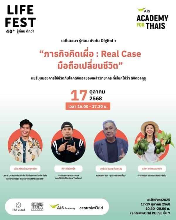 ทั้งนี้ ยังมีกิจกรรมเวิร์กชอปและสิทธิพิเศษที่บูธ AIS ACADEMY for THAIs ในวันศุกร์ที่ 17 ตุลาคม 2568 เวลา 10.00 – 20.00 น. ณ centralwOrld PULSE ชั้น 7 ผู้สนใจสามารถลงทะเบียนเข้าร่วมงานฟรี ดูรายละเอียดเพิ่มเติมที่เพจ AIS Academy