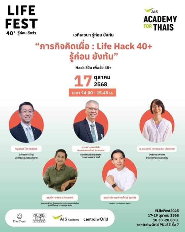 เอไอเอส เตรียมปลุกพลังการเรียนรู้ครั้งใหญ่ในงาน AIS ACADEMY for THAIs at LIFE FEST 40+ ยกทัพกูรูและผู้เชี่ยวชาญจากหลากหลายวงการมาร่วมเปิดมุมมองและเคล็ดลับการใช้ชีวิต ภายใต้แนวคิด “ภารกิจคิดเผื่อ” ที่มุ่งส่งต่อแรงบันดาลใจและทักษะดิจิทัลสำคัญ เพื่อให้คนไทยทุกเพศทุกวัยพร้อมรับมือกับการเปลี่ยนแปลง และต่อยอดไปสู่โอกาสใหม่ในชีวิต โดยงานนี้เอไอเอสจับมือพันธมิตรชั้นนำ อาทิ Superjeew Event, The Cloud และอีกหลายเครือข่าย มาร่วมสร้างเวทีแห่งพลังบวก ที่จะทำให้ทุกคนก้าวสู่วัยอิสระอย่างมั่นใจและยั่งยืน