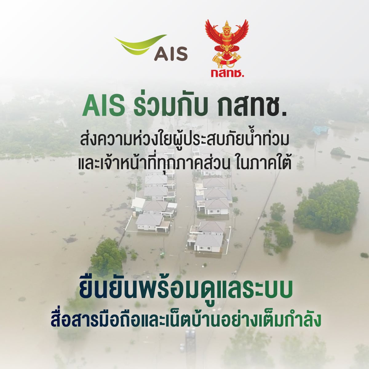 จากสถานการณ์น้ำท่วมที่เกิดขึ้นในพื้นที่ภาคใต้ของประเทศไทยที่ส่งผลกระทบแก่ประชาชน AIS และ กสทช. ขอส่งกำลังใจให้ประชาชนที่อยู่ในพื้นที่ รวมถึงเจ้าหน้าที่จากทุกหน่วยงานซึ่งกำลังปฏิบัติหน้าที่ช่วยเหลือผู้ประสบภัยในขณะนี้ โดยพร้อมอยู่เคียงข้างดูแลจนกว่าสถานการณ์จะเข้าสู่สภาวะปกติ ด้วยมาตรการดังนี้