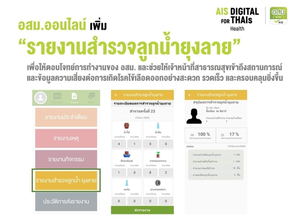 เอไอเอส โดยแอปพลิเคชัน อสม. ออนไลน์ ออกฟีเจอร์ใหม่ “รายงานสำรวจลูกน้ำยุงลาย” รับมือโรคไข้เลือดออกในประเทศไทย สร้างเครื่องมือช่วยเพิ่มประสิทธิภาพการทำงานของเจ้าหน้าที่สาธารณสุข และกลุ่มอาสาสมัครสาธารณสุขประจำหมู่บ้าน (อสม.) ให้การเฝ้าระวังและป้องกันการระบาดของโรคไข้เลือดออกได้เร็วขึ้น พร้อมใช้งานแล้วทั่วประเทศ