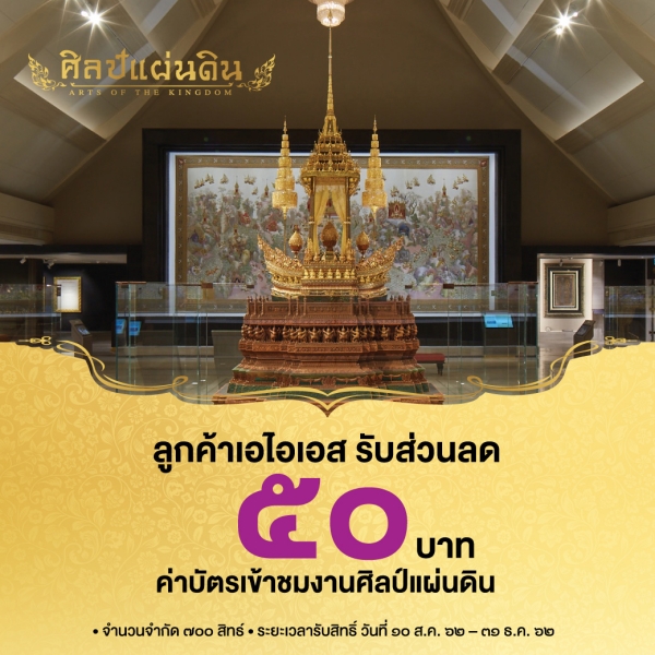 เอไอเอส ร่วมเปิดประสบการณ์ใหม่ให้ลูกค้าได้เรียนรู้ประวัติศาสตร์และร่วมสืบสานมรดกทางศิลปวัฒนธรรมอันวิจิตรงดงาม ผ่านผลงาน “ศิลป์แผ่นดิน” งานหัตถศิลป์ชั้นสูงที่หาชมยาก โดยช่างฝีมือคนไทยจากสถาบันสิริกิติ์ สวนจิตรลดา มูลนิธิส่งเสริมศิลปาชีพ ในสมเด็จพระนางเจ้าสิริกิติ์พระบรมราชินีนาถ โดยพิพิธภัณฑ์ศิลป์แผ่นดิน จ.พระนครศรีอยุธยา เปิดให้ผู้ที่สนใจเข้าชมได้ทุกวันอังคาร – วันอาทิตย์ ตั้งแต่เวลา 10.00 – 15.30 น. บัตรเข้าชมราคา 150 บาท นักเรียน นักศึกษา และผู้สูงอายุ 75 บาท (แสดงบัตรประจำตัว) สำหรับลูกค้าเอไอเอส รับสิทธิพิเศษส่วนลดค่าเข้าชม มูลค่า 50 บาท เพียงกดรหัส ณ จุดจำหน่ายบัตร (1 หมายเลขต่อ 1 สิทธิ์ต่อเดือน) ตั้งแต่วันนี้ จนถึง 31 ธันวาคม 2562 ผู้ที่สนใจติดตามรายละเอียดเพิ่มเติมได้ทาง http://privilege.ais.co.th/