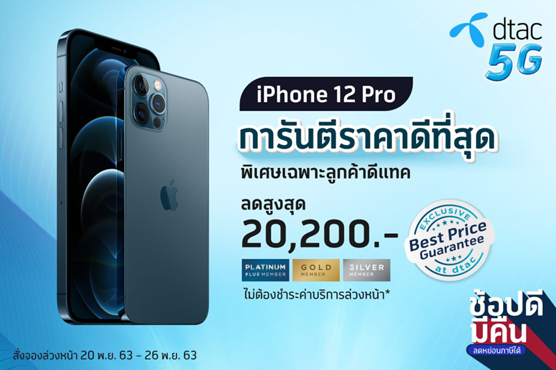 ลูกค้าที่ซื้อ iPhone 12 Pro Max, iPhone 12 Pro, iPhone 12 และ iPhone 12 Mini จะได้รับส่วนลดค่าเครื่องสูงสุด 20,200 บาท ผ่อน 0% นานสูงสุด 36 เดือน หรือรับเครดิตเงินคืนสูงสุด 5% บริการเปลี่ยนหน้าจอฟรี 1 ครั้งในระยะเวลา 1 ปี และส่วนลดซื้ออุปกรณ์เสริม Apple สูงสุด 30% พิเศษสำหรับลูกค้าที่สั่งซื้อล่วงหน้า รับสิทธิ์ซื้อ อะแดปเตอร์แปลงไฟ USB-C ในราคาเพียง 50 บาท จากปกติ 690 บาท ลูกค้าดีแทคที่มีอายุการใช้งาน 6 เดือนขึ้นไปสามารถซื้อเครื่องได้ในราคาพิเศษโดยไม่ต้องชำระค่าบริการล่วงหน้า