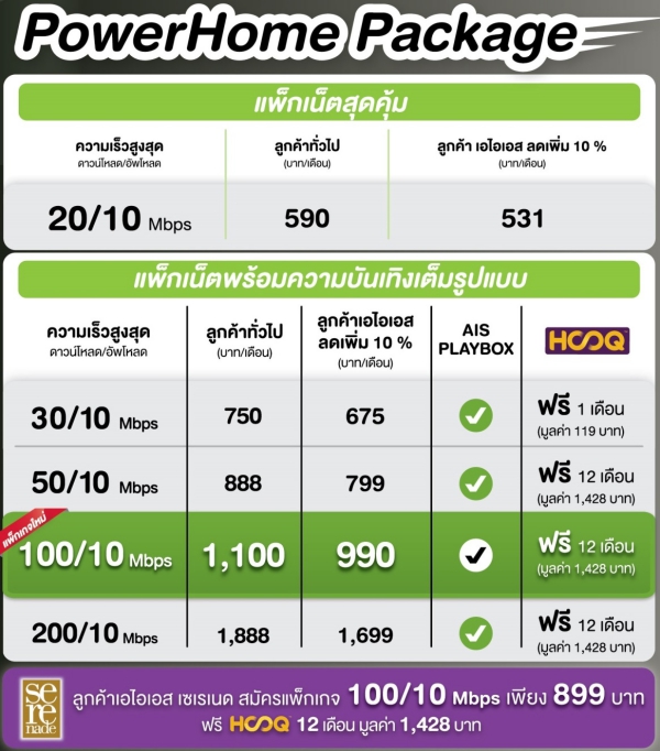 ด้วยความเข้าใจอย่างลึกซึ้งถึงพฤติกรรมของครอบครัวยุคดิจิทัล วันนี้ เอไอเอส ไฟเบอร์ จึงเป็นผู้ให้บริการรายแรกที่ลุกขึ้นมาสร้างมาตรฐานเน็ตบ้านโฉมใหม่ ให้สอดคล้องกับการใช้งานได้ดียิ่งขึ้น ด้วยการเปิดตัว แพ็กเกจใหม่ล่าสุด 100/10 Mbps ในราคาไม่ถึงพันบาท หรือเพียง 990 บาท/เดือน สำหรับลูกค้าเอไอเอส พิเศษ!! เหลือเพียง 899 บาท/เดือน สำหรับลูกค้าเอไอเอส เซเรเนด (รับสิทธิ์ได้ ตั้งแต่เซเรเนด เอ็มเมอรัลด์ ขึ้นไป) ซึ่งถือเป็นแพ็กเกจที่คุ้มค่าที่สุดในตลาดเท่าที่เคยมีมา ในราคาที่ใครก็เป็นเจ้าของได้ ซึ่งมาพร้อมความบันเทิงระดับพรีเมี่ยมจากกล่องเอไอเอส เพลย์บ็อกซ์ ให้ดูฟรี! ทีวี ภาพยนตร์ ซีรี่ส์ การ์ตูน กีฬา คอนเสิร์ต คาราโอเกะ พร้อมคอนเทนต์ฮอลลีวู้ดจาก HOOQ นาน 12 เดือน (มูลค่า 1,428บาท) ด้วยความคมชัดระดับ HD พร้อมรับฟรี! อุปกรณ์ Router ที่ได้มาตรฐานและคุณภาพดีที่สุด เพื่อการกระจายสัญญาณได้อย่างเต็มประสิทธิภาพ เต็มสปีดตามที่การันตีในแพ็กเกจ ซึ่งเหมาะกับครอบครัวยุคดิจิทัล ที่สมาชิกในบ้านชื่นชอบการเชื่อมต่อออนไลน์และโลกโซเชียล รวมถึงเหล่า Trend Setter, IT Lover, Online Gamer และ Home Office ซึ่งรองรับการใช้ดีไวซ์หลายตัวพร้อมกันภายในบ้านได้อย่างดี ทำให้แพ็กเกจ 100/10 Mbps เป็นแพ็กที่ครบครัน ทั้งเรื่องความเร็ว และ ฟรี! คอนเทนต์บันเทิงแบบไม่อั้นในแพ็กเดียว มอบความแตกต่างและคุ้มค่าที่สุดในตลาด ณ ขณะนี้ ”